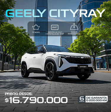 (1)Simulación corresponde a producto Compra Inteligente operado por Forum Servicios Financieros S.A, con un 50% de pie, 48 cuotas y cuotón (cuota n° 49VFMG). Válido para GEELY CITYRAY COMFORT. Precio lista corresponde a $17.890.000. Precio con bono $16.790.000, incluye bono de $1.100.000 con financiamiento Forum , 48 cuotas de $195.990 más cuota n° 49 de $6.728.319 y un pie de 50% ($8.366.420), CAE 24,21%, Costo Total del Crédito $16.135.839, Monto Total del Crédito $8.809.259, Costo Total del Vehículo $24.502.259. Crédito sujeto a verificación de antecedentes financieros y comerciales del Cliente. Crédito incluye gastos operacionales y seguro de desgravamen. La contratación de cualquier seguro asociado al crédito ofrecido es de carácter voluntario. No válidos para Zona Franca. Vigencia promoción hasta 31 octubre 2025.