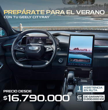 (1)Simulación corresponde a producto Compra Inteligente operado por Forum Servicios Financieros S.A, con un 50% de pie, 48 cuotas y cuotón (cuota n° 49VFMG). Válido para GEELY CITYRAY COMFORT. Precio lista corresponde a $17.890.000. Precio con bono $16.790.000, incluye bono de $1.100.000 con financiamiento Forum , 48 cuotas de $193.990 más cuota n° 49 de $6.728.299 y un pie de 50% ($8.368.760), CAE 23,97%, Costo Total del Crédito $16.039.819, Monto Total del Crédito $8.806.901, Costo Total del Vehículo $24.408.579. Crédito sujeto a verificación de antecedentes financieros y comerciales del Cliente. Crédito incluye gastos operacionales y seguro de desgravamen. La contratación de cualquier seguro asociado al crédito ofrecido es de carácter voluntario. No válidos para Zona Franca. Vigencia promoción hasta 31 diciembre 2025.