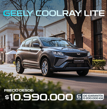 (2)Simulación corresponde a producto Compra Inteligente operado por Forum Servicios Financieros S.A, con un 50% de pie, 48 cuotas y cuotón (cuota n° 49VFMG). Válido para GEELY COOLRAY LITE 1.5 CVT PRIME. Precio lista corresponde a $13.490.000. Precio con bono $11.990.000, incluye bono de $1.500.000 con financiamiento Forum , 48 cuotas de $169.990 más cuota n° 49 de $4.804.910 y un pie de 50% ($5.984.490), CAE 30,56%, Costo Total del Crédito $12.964.430, Monto Total del Crédito $6.371.688, Costo Total del Vehículo $18.948.920. Crédito sujeto a verificación de antecedentes financieros y comerciales del Cliente. Crédito incluye gastos operacionales y seguro de desgravamen. La contratación de cualquier seguro asociado al crédito ofrecido es de carácter voluntario. No válidos para Zona Franca. Vigencia promoción hasta 31 octubre 2025.
