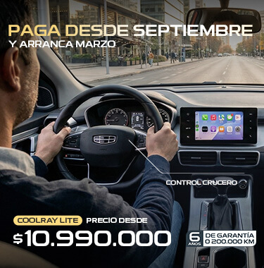(3)Simulación corresponde a producto Compra Inteligente operado por Forum Servicios Financieros S.A, con un 50% de pie, 48 cuotas y cuotón (cuota n° 49VFMG). Válido para GEELY COOLRAY LITE 1.5 MT POP +. Precio lista corresponde a $13.290.000. Precio con bono $11.790.000, incluye bono de $1.500.000 con financiamiento Forum , 48 cuotas de $204.990 más cuota n° 49 de $4.726.109 y un pie de 50% ($5.892.726), CAE 32,55%, Costo Total del Crédito $14.565.629, Monto Total del Crédito $6.262.580, Costo Total del Vehículo $20.458.355. Crédito sujeto a verificación de antecedentes financieros y comerciales del Cliente. Crédito incluye gastos operacionales y seguro de desgravamen. La contratación de cualquier seguro asociado al crédito ofrecido es de carácter voluntario. No válidos para Zona Franca. Vigencia promoción hasta 15 marzo 2026.