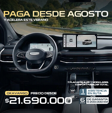 (3)Simulación corresponde a producto Compra Inteligente operado por Forum Servicios Financieros S.A, con un 50% de pie, 48 cuotas y cuotón (cuota n° 49VFMG). Válido para GEELY OKAVANGO EXCLUSIVE GK 2.0 7DCT COLOR NEGRO. Precio lista corresponde a $24.690.000. Precio con bono $20.690.000, incluye bono de $4.000.000 ($2.000.000 con cualquier medio de pago más $2.000.000 con financiamiento Forum), 48 cuotas de $257.990 más cuota n° 49 de $8.293.386 y un pie de 50% ($10.320.334), CAE 22,64%, Costo Total del Crédito $20.676.906, Monto Total del Crédito $10.771.039, Costo Total del Vehículo $30.997.240. Crédito sujeto a verificación de antecedentes financieros y comerciales del Cliente. Crédito incluye gastos operacionales y seguro de desgravamen. La contratación de cualquier seguro asociado al crédito ofrecido es de carácter voluntario. No válidos para Zona Franca. Vigencia promoción hasta 15 febrero 2026.
