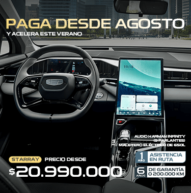 (1)Simulación corresponde a producto Compra Inteligente operado por Forum Servicios Financieros S.A, con un 50% de pie, 48 cuotas y cuotón (cuota n° 49VFMG). Válido para GEELY STARRAY EXCLUSIVE 2.0T 7DCT. Precio lista corresponde a $23.990.000. Precio con bono $20.990.000, incluye bono de $3.000.000 ($1.000.000 con cualquier medio de pago más $2.000.000 con financiamiento Forum), 48 cuotas de $260.990 más cuota n° 49 de $8.413.603 y un pie de 50% ($10.486.764), CAE 22,63%, Costo Total del Crédito $20.941.123, Monto Total del Crédito $10.905.687, Costo Total del Vehículo $31.427.887. Crédito sujeto a verificación de antecedentes financieros y comerciales del Cliente. Crédito incluye gastos operacionales y seguro de desgravamen. La contratación de cualquier seguro asociado al crédito ofrecido es de carácter voluntario. No válidos para Zona Franca. Vigencia promoción hasta 15 febrero 2026.