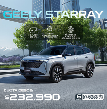 (1)Simulación corresponde a producto Compra Inteligente operado por Forum Servicios Financieros S.A, con un 50% de pie, 48 cuotas y cuotón (cuota n° 49VFMG). Válido para GEELY STARRAY EXCLUSIVE 2.0T 7DCT. Precio lista corresponde a $23.990.000. Precio con bono $20.990.000, incluye bono de $3.000.000 ($1.000.000 con cualquier medio de pago más $2.000.000 con financiamiento Forum), 48 cuotas de $232.990 más cuota n° 49 de $8.411.277 y un pie de 50% ($10.468.146), CAE 22,80%, Costo Total del Crédito $19.594.797, Monto Total del Crédito $10.924.455, Costo Total del Vehículo $30.062.943. Crédito sujeto a verificación de antecedentes financieros y comerciales del Cliente. Crédito incluye gastos operacionales y seguro de desgravamen. La contratación de cualquier seguro asociado al crédito ofrecido es de carácter voluntario. No válidos para Zona Franca. Vigencia promoción hasta 30 noviembre 2025.