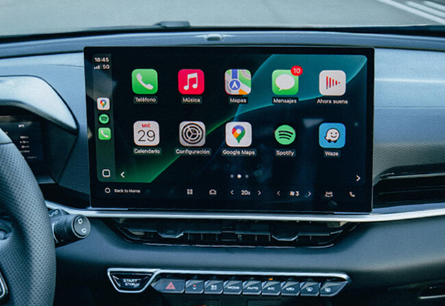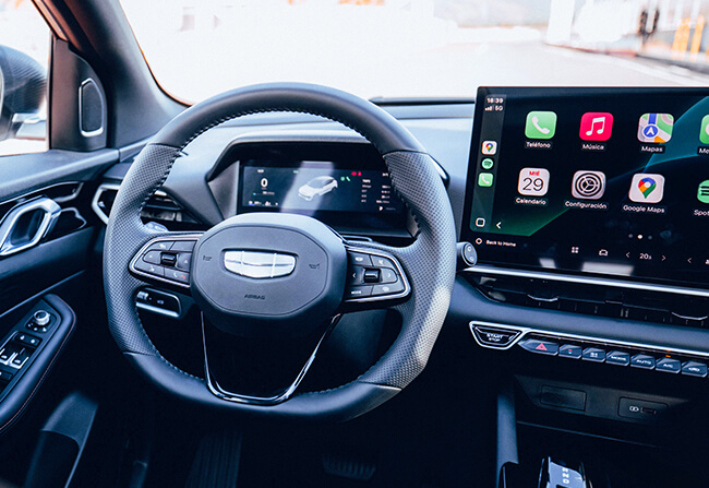 Conecta tu smartphone y mantén todo bajo control de forma segura. Accede a llamadas, mensajes, música y navegación directamente en la pantalla del New Coolray gracias a Apple CarPlay® y Android Auto®, usando comandos de voz o la interfaz táctil para una experiencia simple, intuitiva y sin distracciones. (Disponible desde marzo 2026)