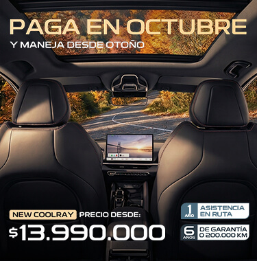 (1)Simulación corresponde a producto Compra Inteligente Maxx operado por Forum Servicios Financieros S.A, con un 50% de pie, 48 cuotas y cuotón (cuota n° 49VFMG). Válido para GEELY NEW COOLRAY 1.5TD COMFORT. Precio lista corresponde a $15.490.000. Precio con bono $13.990.000, incluye bono de $1.500.000 . Precio lista corresponde a $11.990.000. Precio con bono $10.690.000, incluye bono de $1.300.000 con cualquier financiamiento Forum, 48 cuotas de $158.990 más cuota n° 49 de $5.606.833  y un pie de 50% ($6.990.853), CAE 23,66%, Costo Total del Crédito $13.238.353, Monto Total del Crédito $7.386.494, Costo Total del Vehículo $20.229.206. Crédito sujeto a verificación de antecedentes financieros y comerciales del Cliente. Crédito incluye gastos operacionales y seguro de desgravamen. La contratación de cualquier seguro asociado al crédito ofrecido es de carácter voluntario. No válidos para Zona Franca. Vigencia promoción hasta 15 abril 2026. Válido hasta agotar stock.